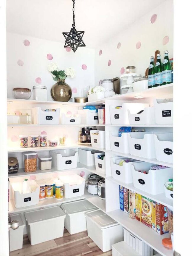 Matching labeled bins help organize baking supplies, snacks, and kitchen tools with precision and style.