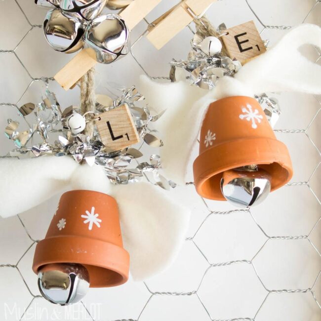 Silver bells peek out from snowflake-painted containers, dancing gracefully from wooden clothespins that connect each charming piece.