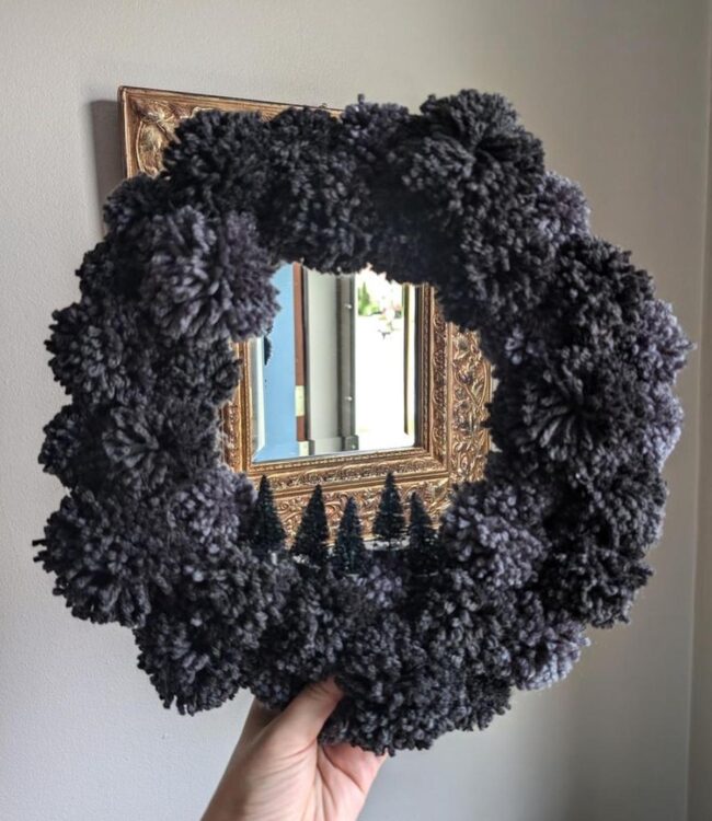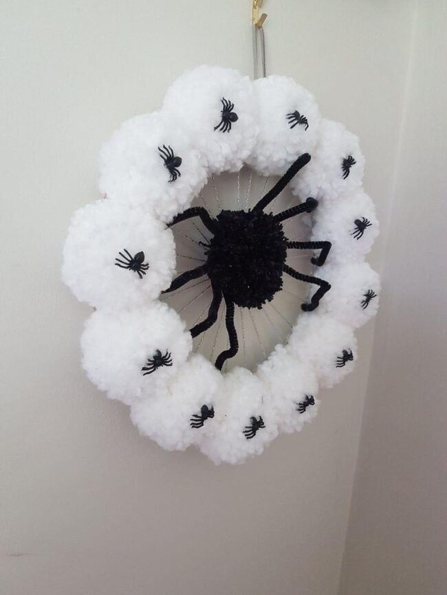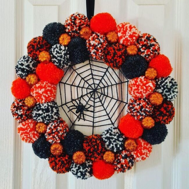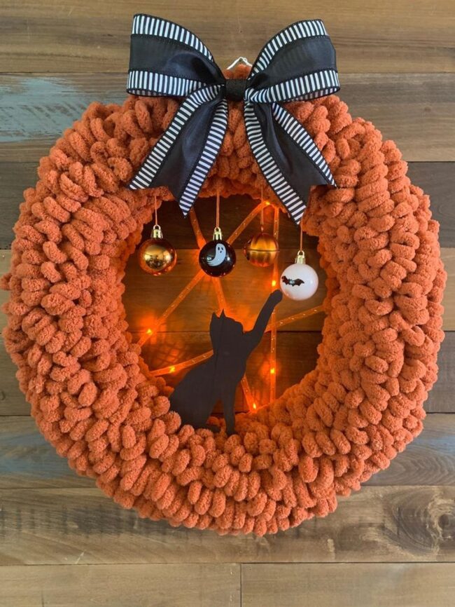 Crafting your own Halloween wreath brings instant magic to any room with its enchanting blend of dark yarn and whimsical details.