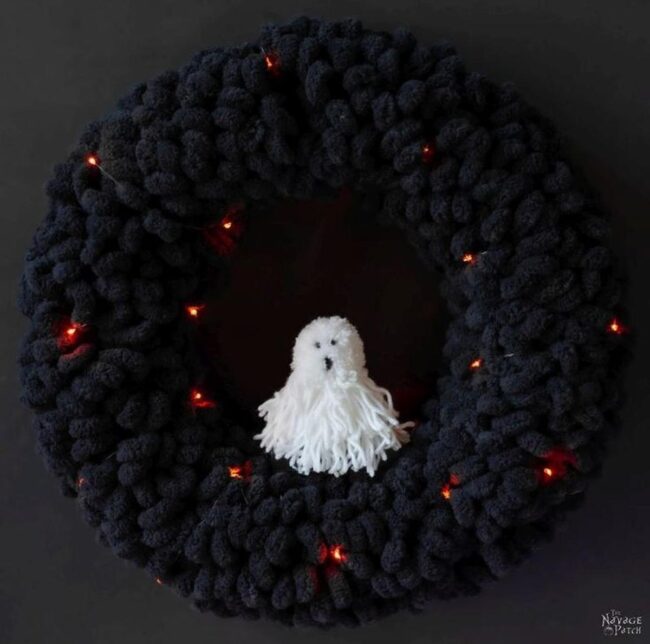 Thick, chunky black yarn loops wrap around the wreath base, creating a rich and inviting texture that begs to be touched.