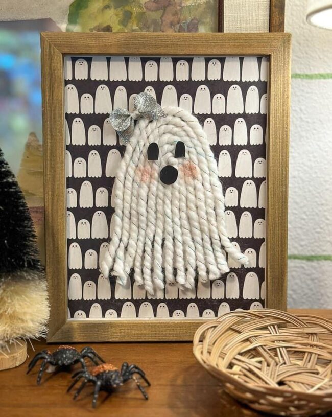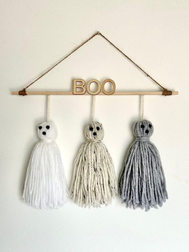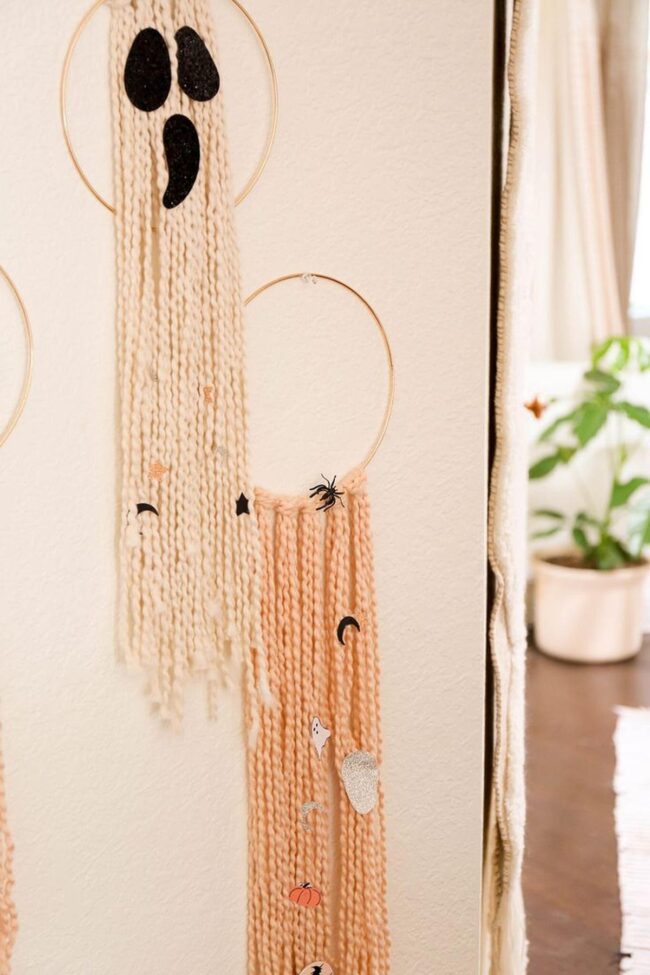 Hanging delicate yarn spirits with tiny black button eyes creates instant personality and conversation-starting wall art that makes guests smile.