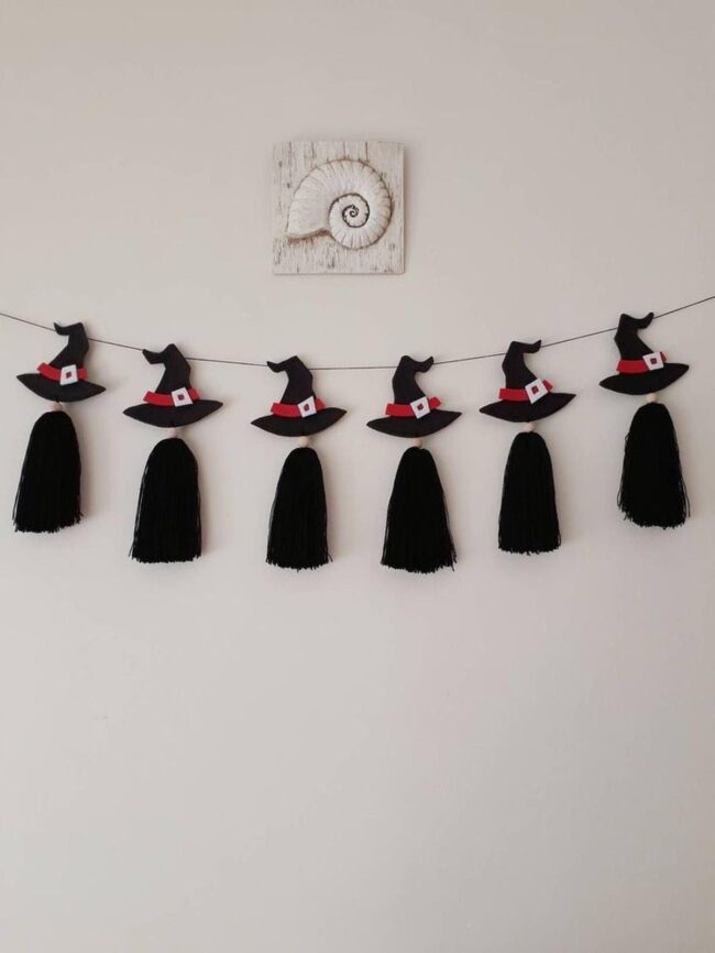 Witch hat garlands burst with enchantment, turning neutral walls into magical wonderlands where unexpected charm dances around you.