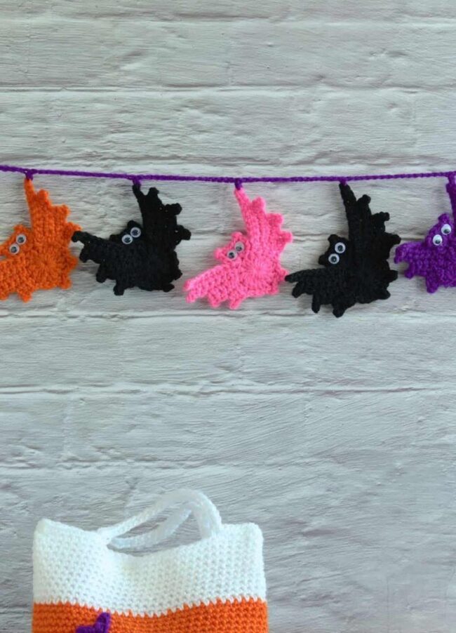 Crocheted bats sporting quirky googly eyes swing from delicate strings, blending unexpected colors like orange, pink, and deep purple to catch everyone's attention.