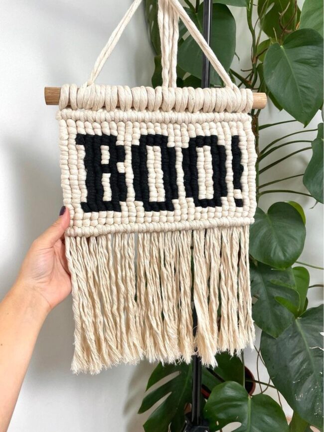 Chunky yarn woven into a cream background turns into your canvas for dramatic black letters spelling "BOO!" Delicate yarn strands dangle beneath the main design, creating mesmerizing movement that catches every eye.