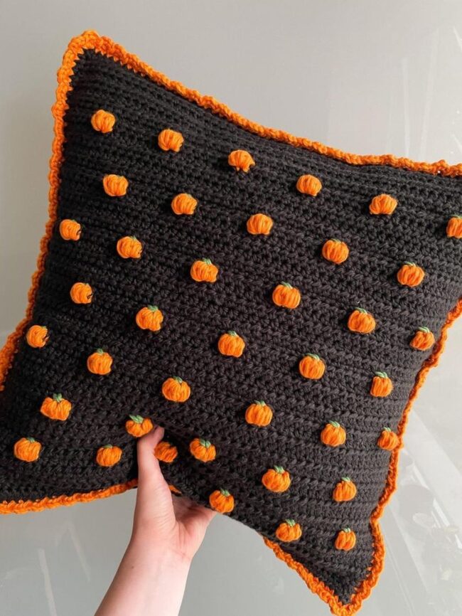 Bouncy pom-poms in bright orange dance along the top edge, bringing playful energy to your handmade masterpiece.