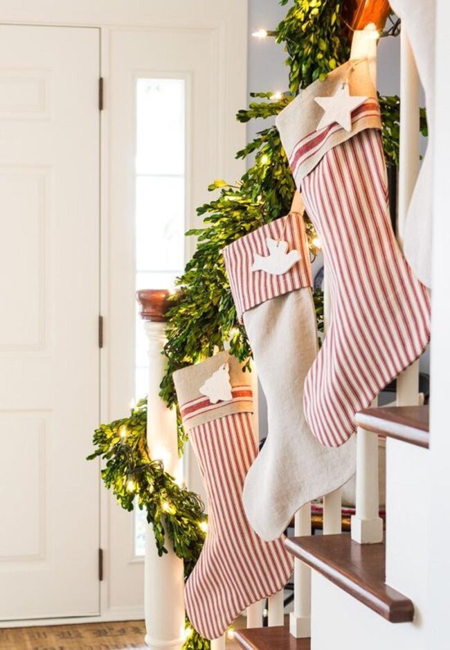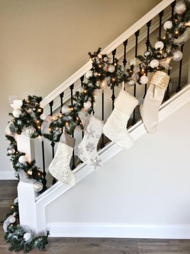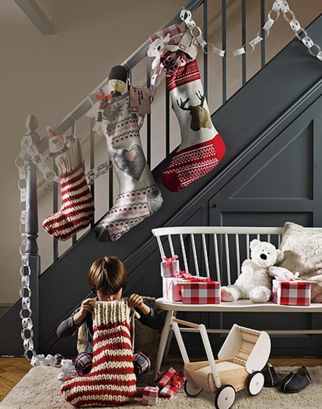 Stockings with whimsical patterns dance from staircase railings, catching eyes with their cheerful designs and festive spirit.