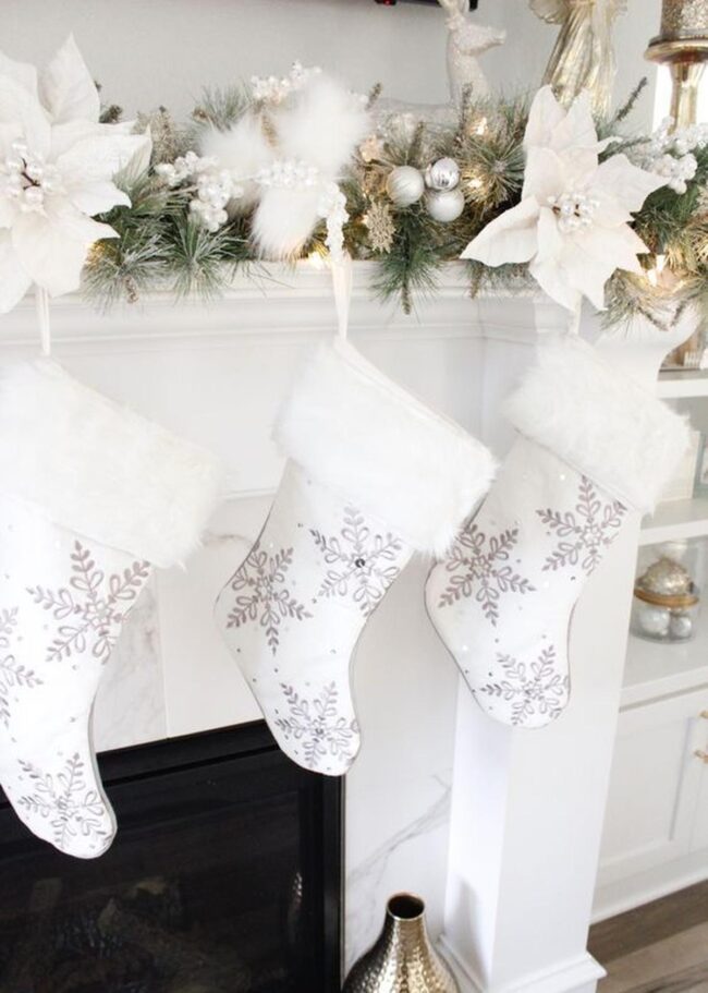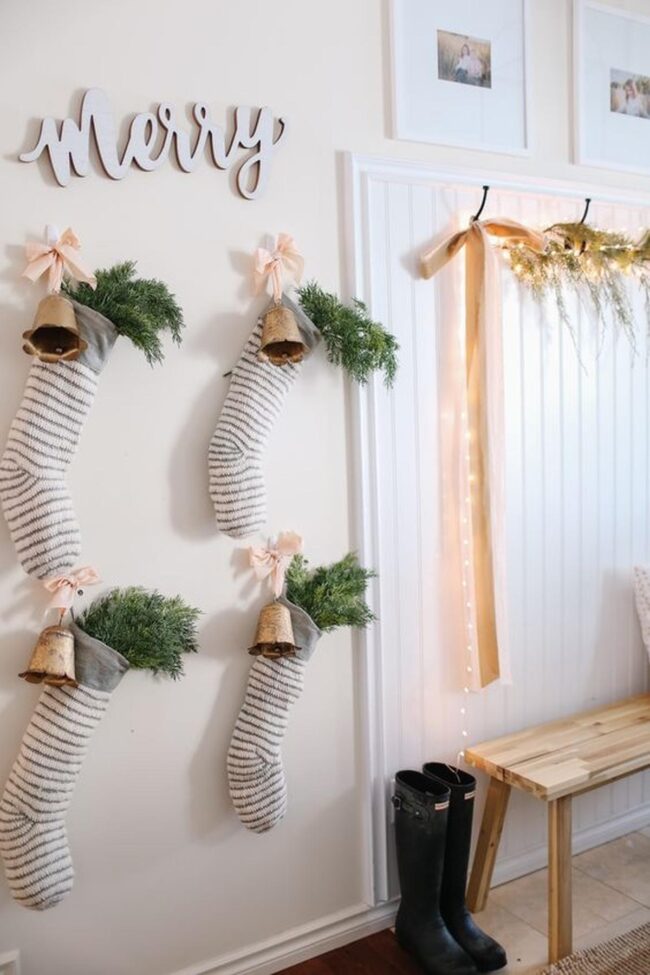 Holiday magic sparkles through carefully chosen stockings hanging gracefully against crisp white wall panels.