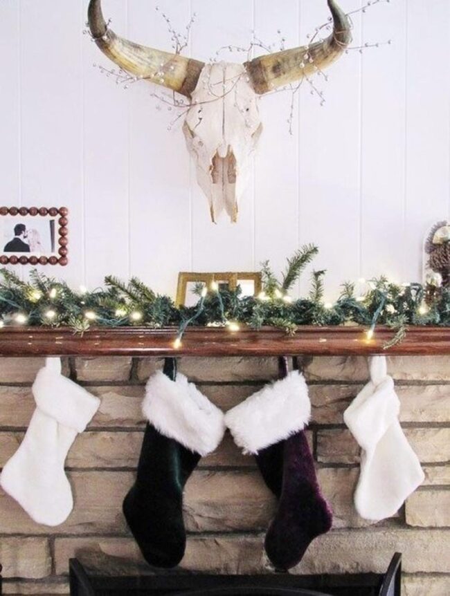 Holiday magic springs to life when you drape a soft white stocking against a striking black fireplace, instantly setting a festive mood.