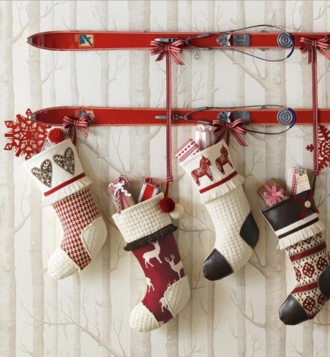 Four charming stockings cascade from glossy red skis, creating a magical focal point that instantly brightens any room's holiday spirit.