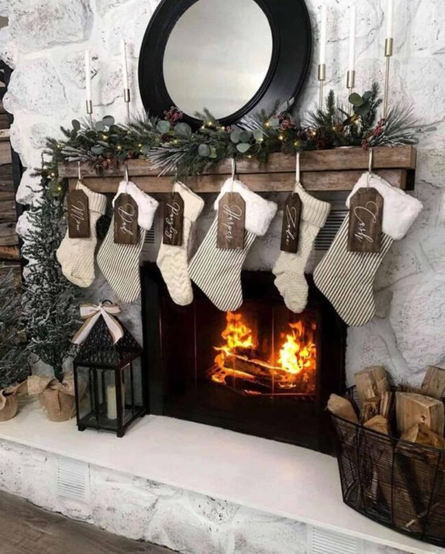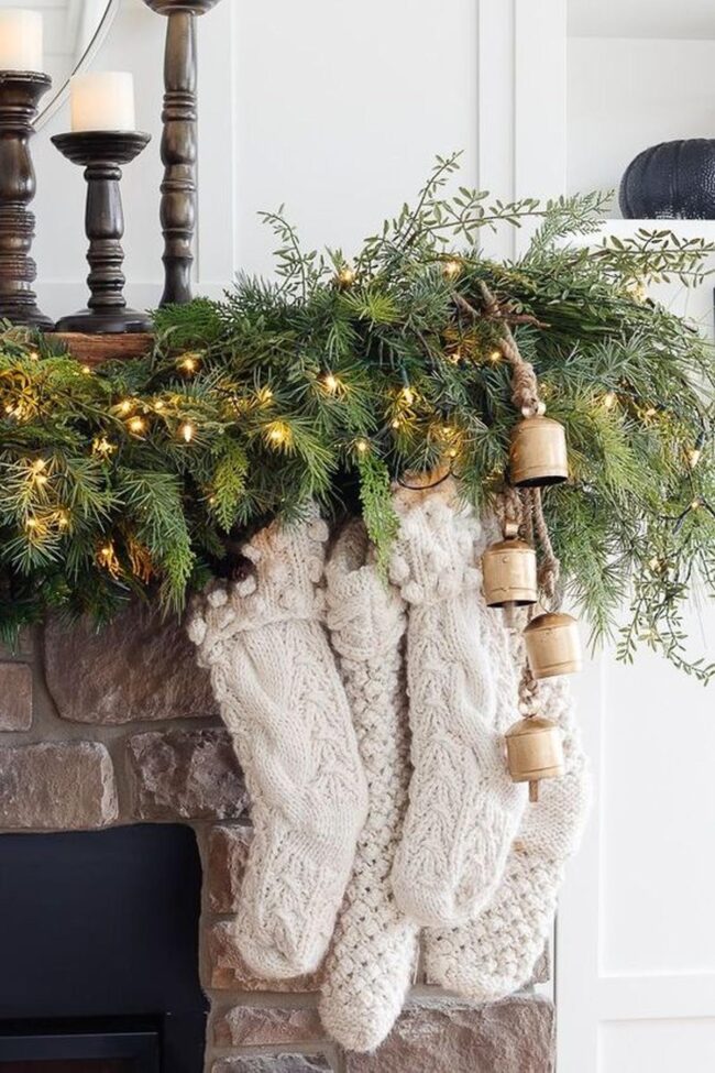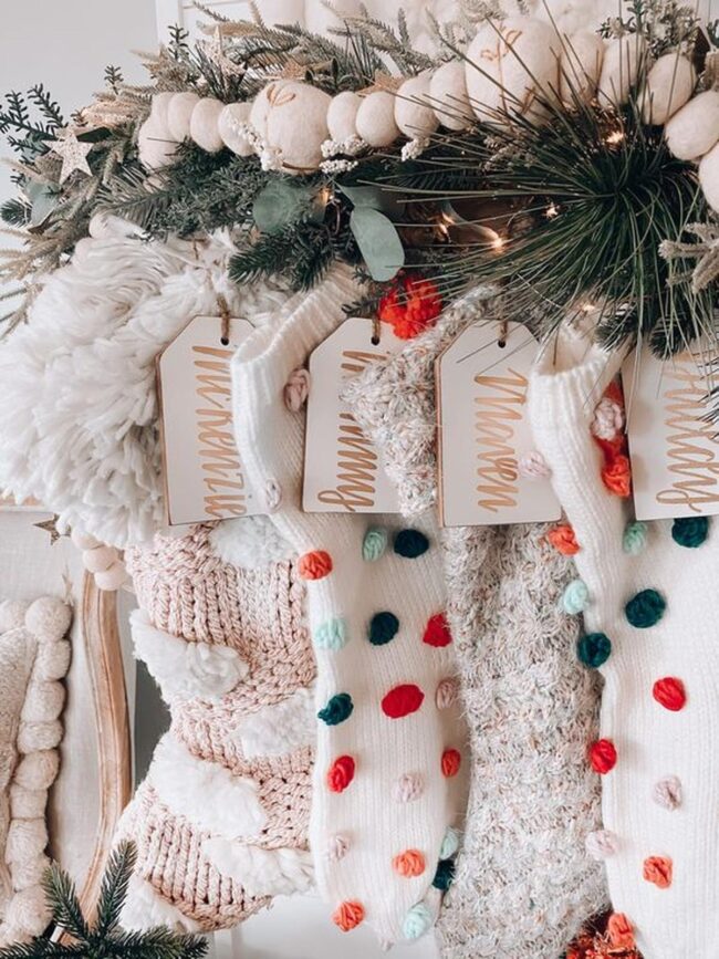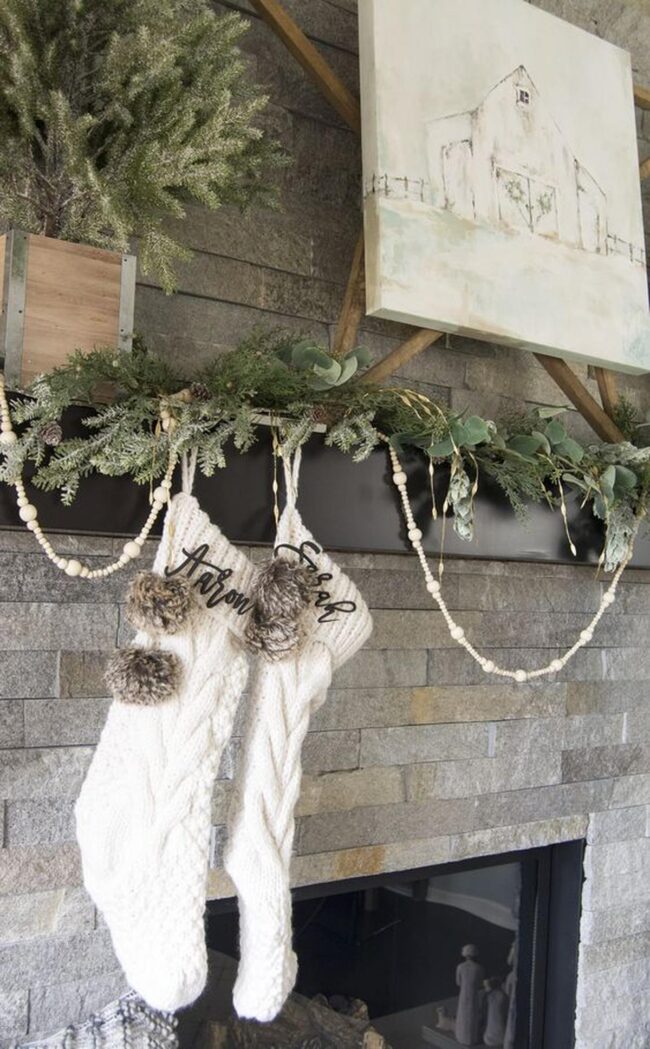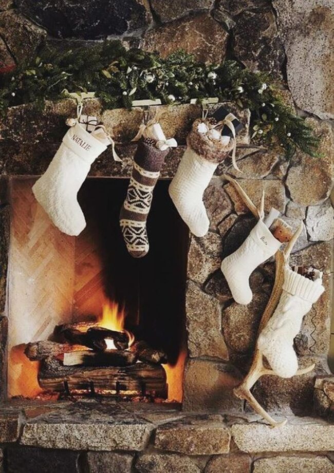 Soft white knitted stockings dangling from wooden mantels invite immediate warmth and connection.