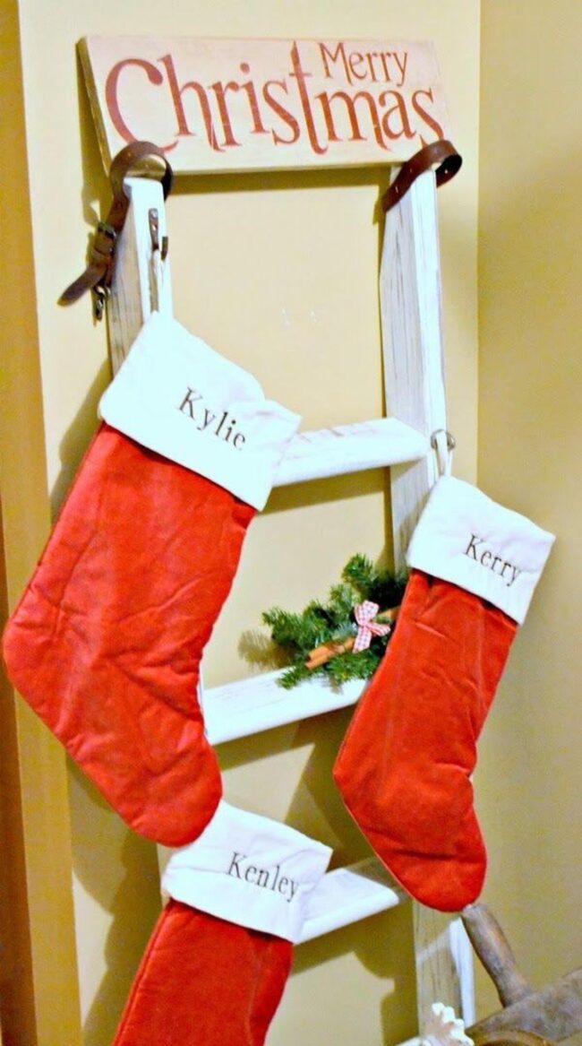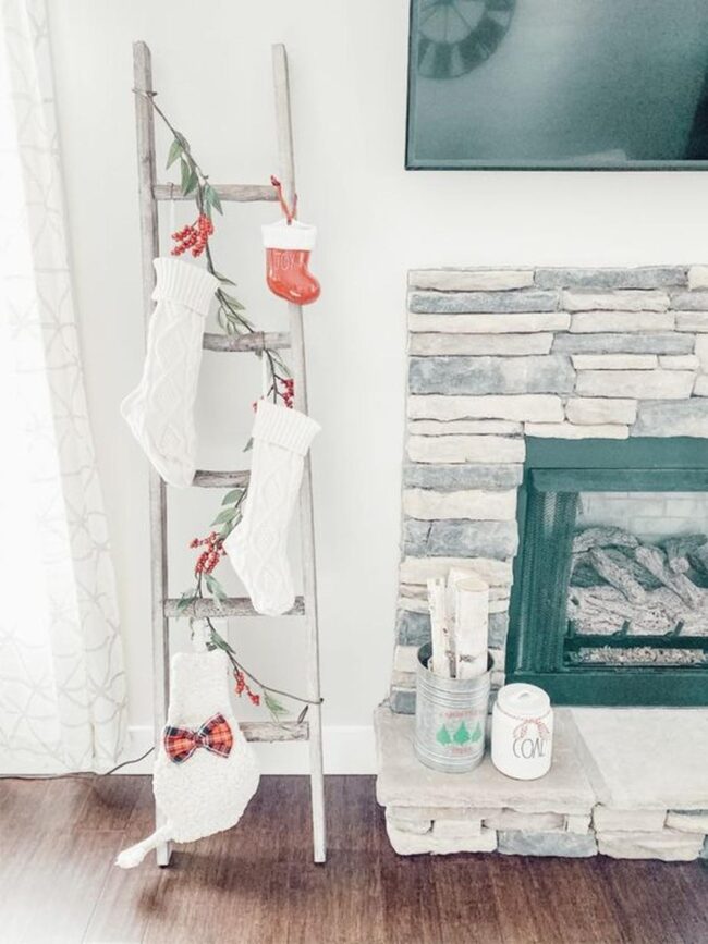 Your space alters with sweet personal touches like personalized stockings hanging from vintage wooden ladders, each adorned with playful white monogram letters and soft red ribbons.