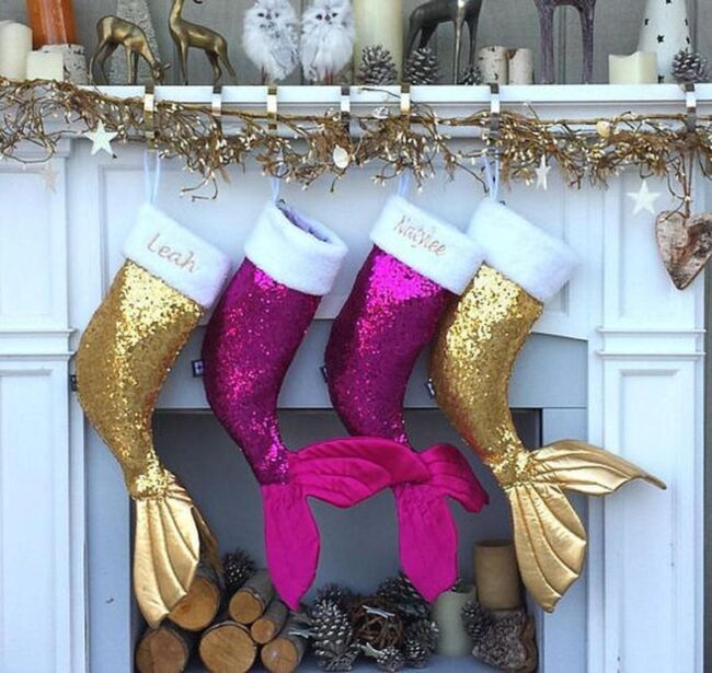 Mermaid tail stockings sparkle with magic, hanging from the fireplace mantel in dreamy pink and gold, each one crowned with soft white trim and personalized with delicate name embroidery.