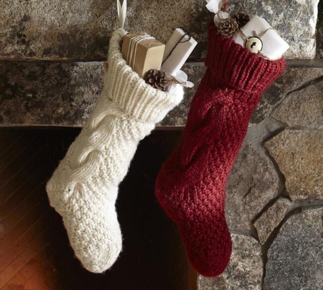 Cozy winter vibes burst to life with cable-knit stockings dangling from a rugged stone fireplace, mixing creamy white and deep red for instant visual appeal.