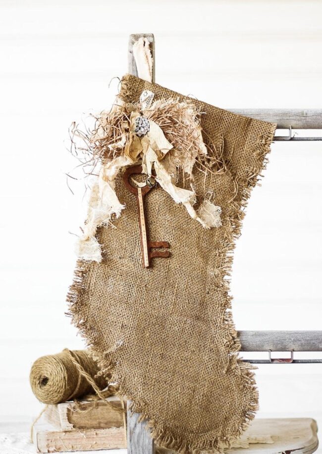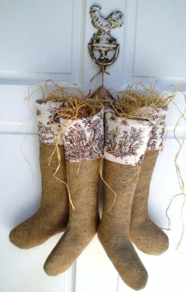 Burlap stockings tweak your holiday door into a welcoming canvas of seasonal joy, with natural straw-like edges peeking playfully from soft fabric cuffs.