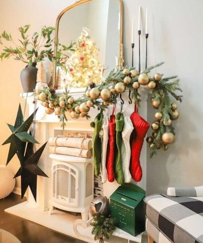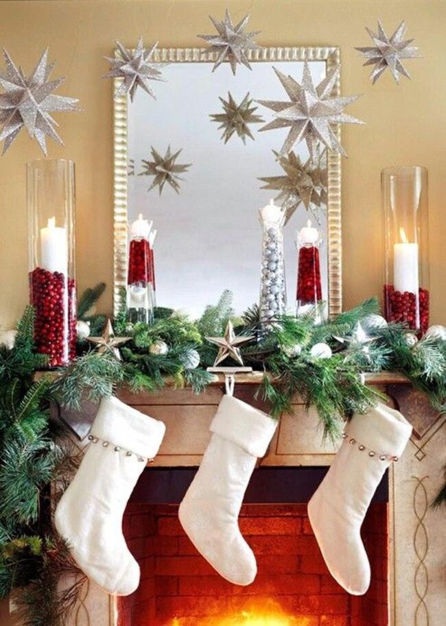 Festive stockings hanging in cheerful colors like deep red and crisp white instantly draw eyes and warm hearts, while strategic placement of star-shaped lanterns adds unexpected character to your decor.