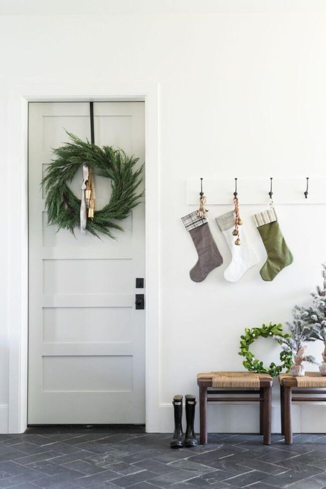 Neutral stockings hanging from sleek black hooks instantly rebuild an ordinary entryway into a charming winter sanctuary.