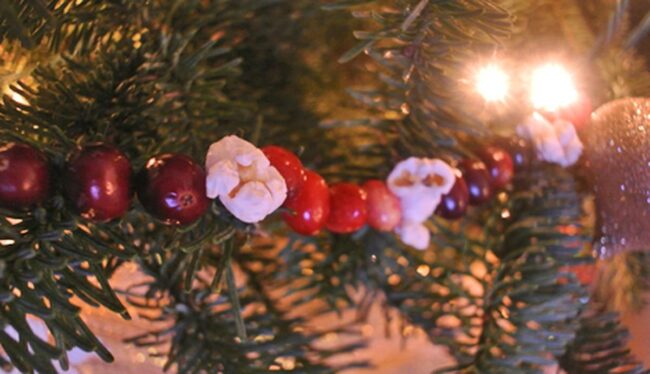 Crimson berries and popcorn strings weave through greenery, creating charming patterns that whisper nostalgic holiday stories.