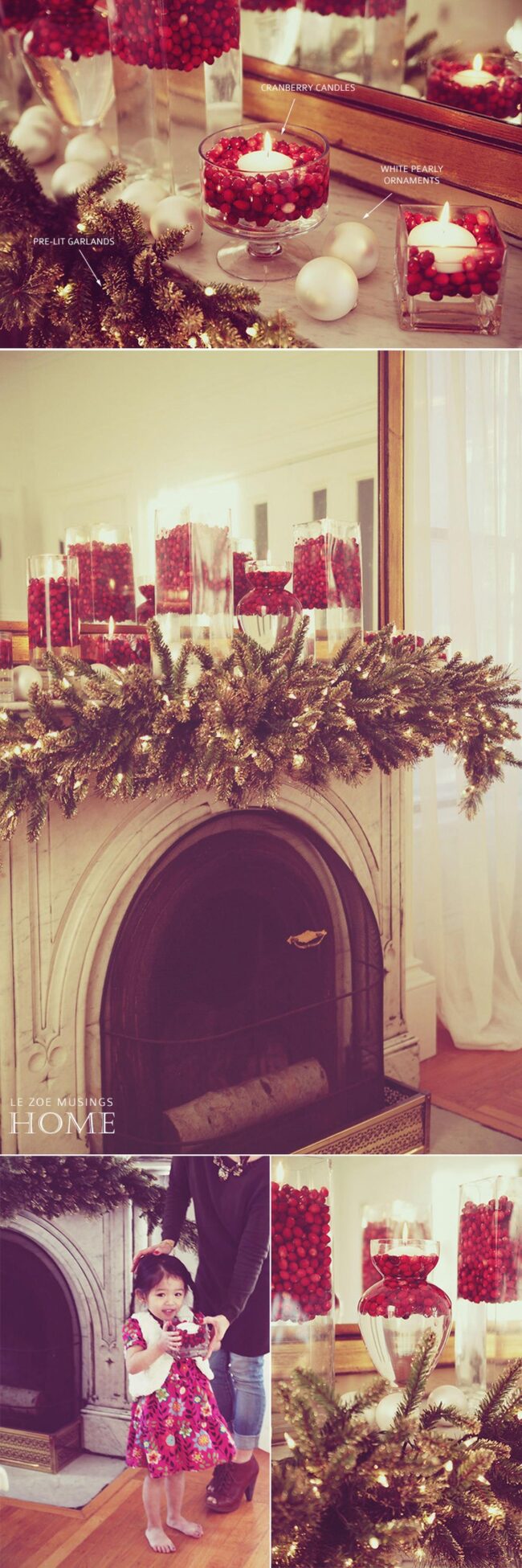 Crimson cranberries nestled in clear tall vases pop brilliantly against evergreen backgrounds, adding dramatic flair to your space.