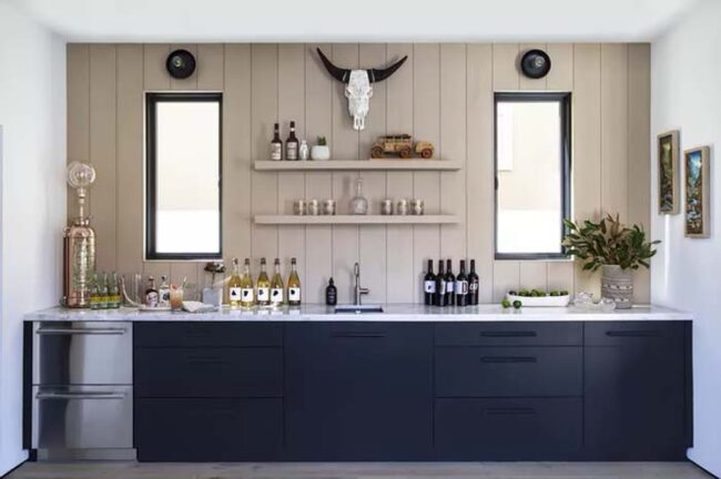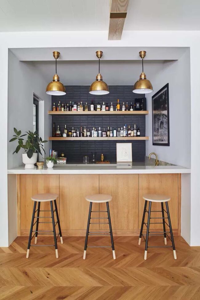 Black and white tiles work beautifully for spelling out words like "Cheers," creating a striking visual focal point near beverage areas.