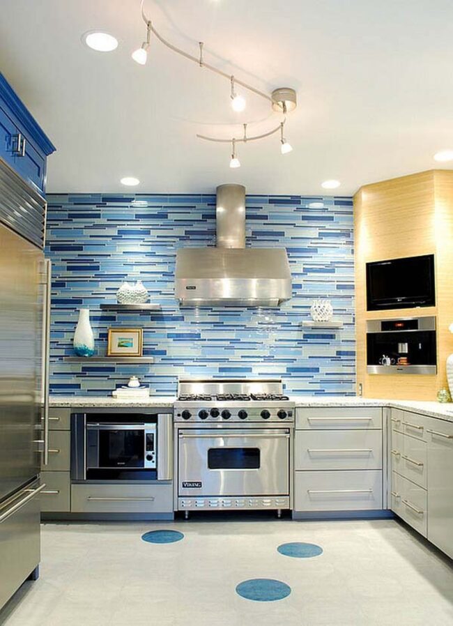 Glass kitchen backsplashes radiate elegance with strategic blue tile selections that capture light and complement surrounding design elements.