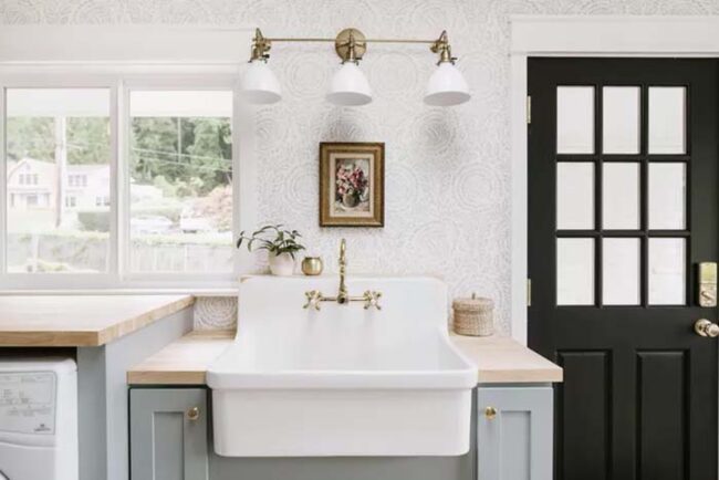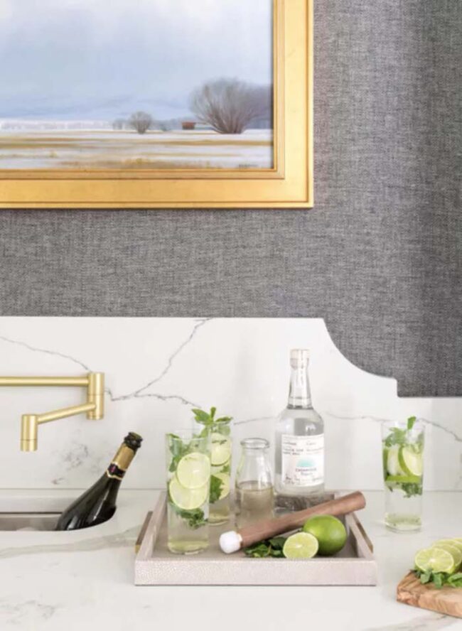 Bold wall coverage adds depth and sophistication to even simplest cabinetry, making the entire room feel more intentional and curated.