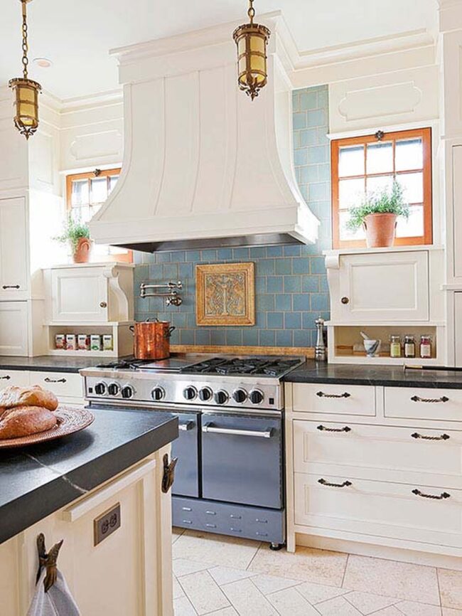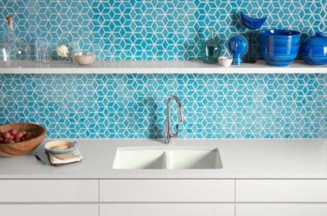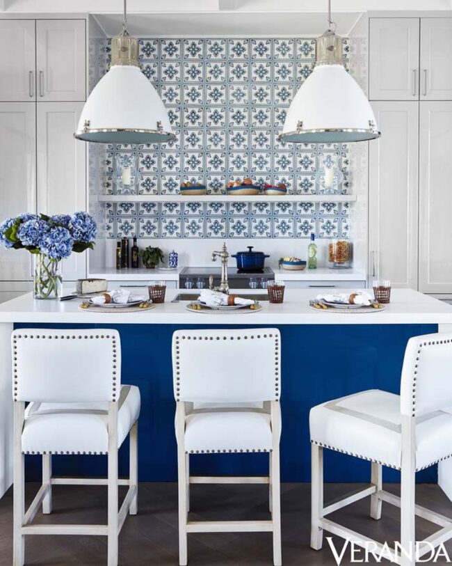 Blue tile backsplashes capture Mediterranean design magic with geometric patterns that elevate kitchen spaces beyond ordinary expectations.