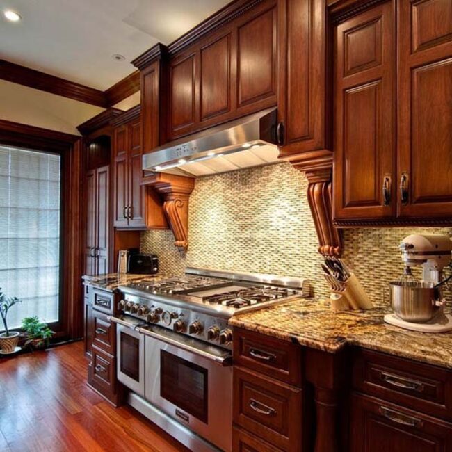 Sophisticated patterns stretch elegantly from countertops to ceiling, framing ranges with architectural grace reminiscent of historic mansion pantries.