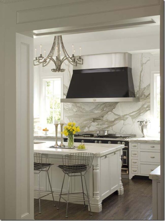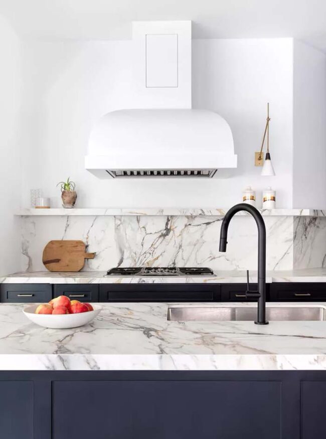 Marble backsplashes elevate kitchen design with unparalleled sophistication, especially Calacatta varieties boasting dramatic white backgrounds and distinctive gray veining.