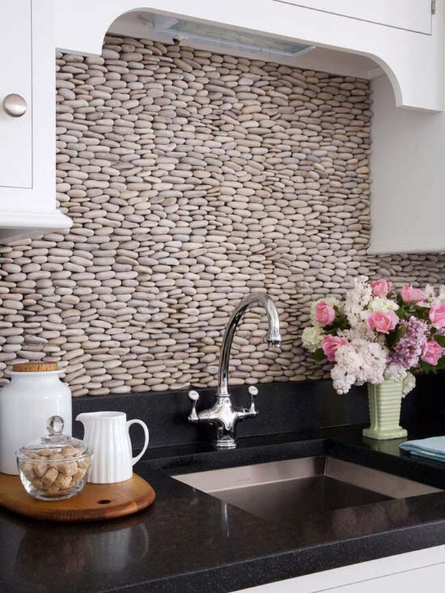 Ceramic or porcelain pebble tiles offer durability and water resistance, making them ideal for high-moisture areas like backsplashes and countertop accents.