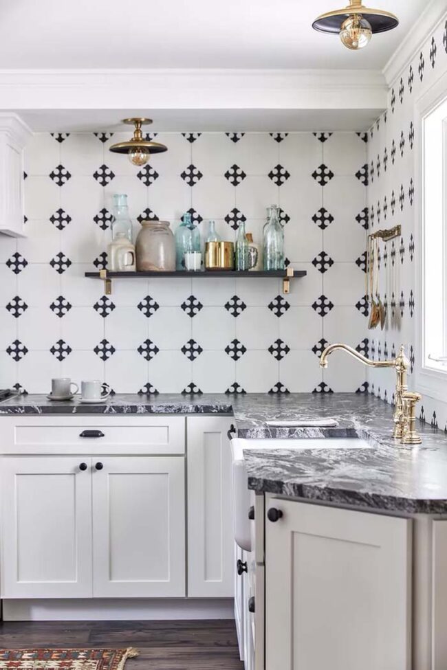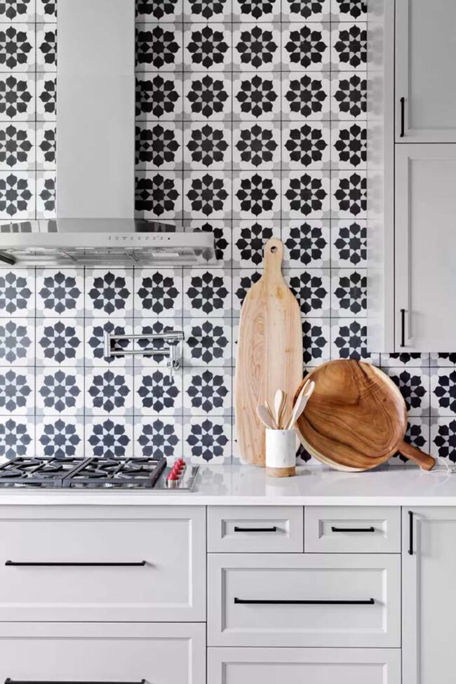 Geometric patterns add dynamic movement and visual interest across kitchen walls.