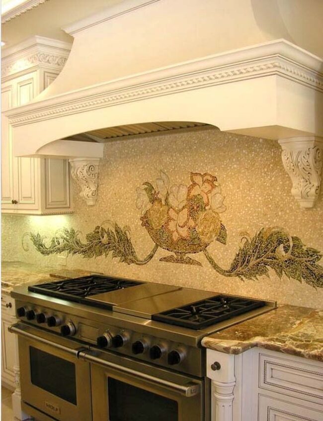 Mosaic sections strategically positioned add interesting focal points that draw the eye across the kitchen landscape.