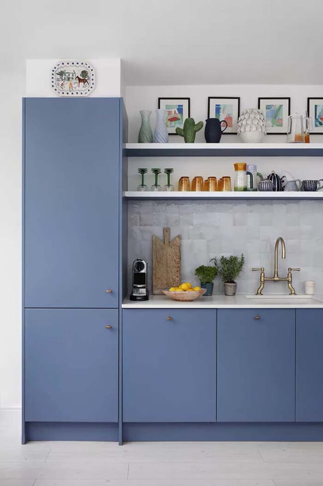 Navy and cerulean hues work exceptionally well with stainless steel appliances, creating sophisticated contrast against neutral countertops.
