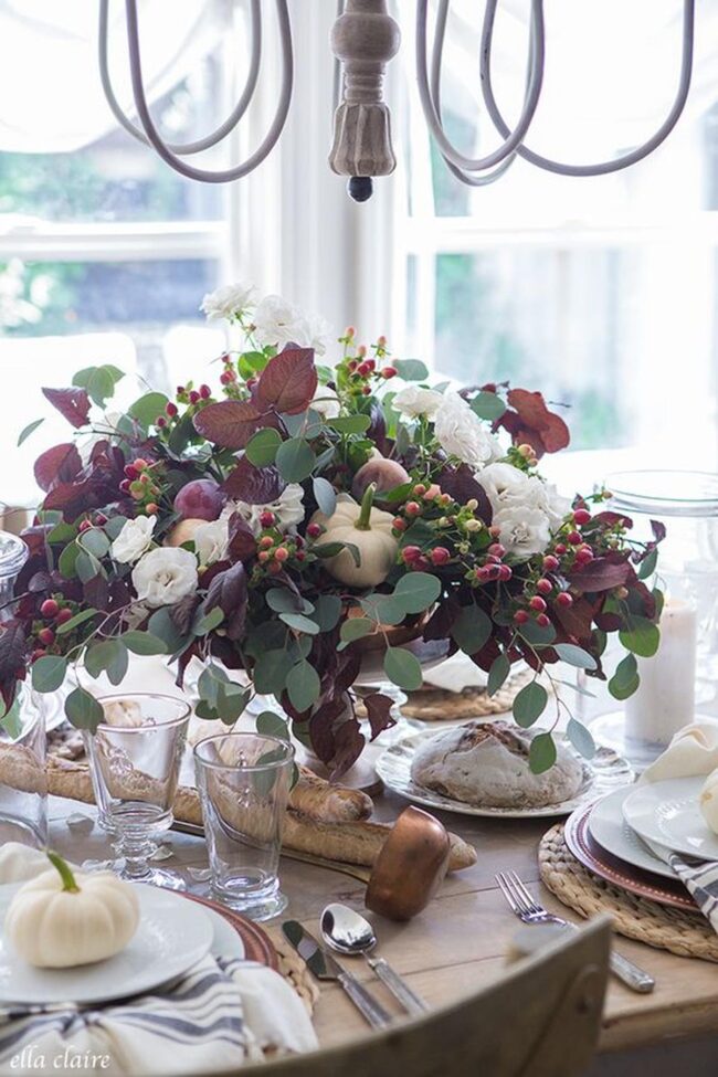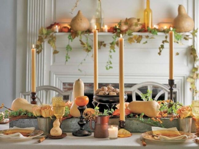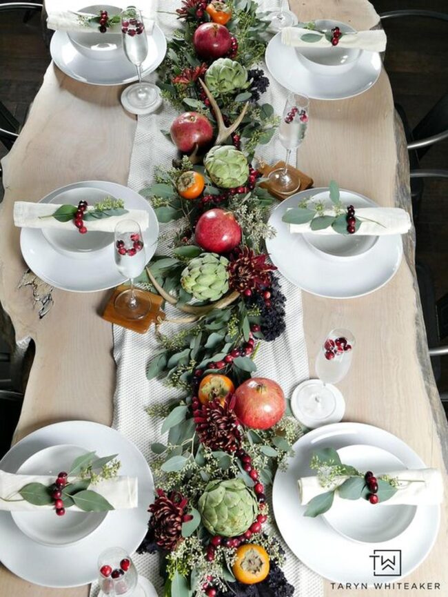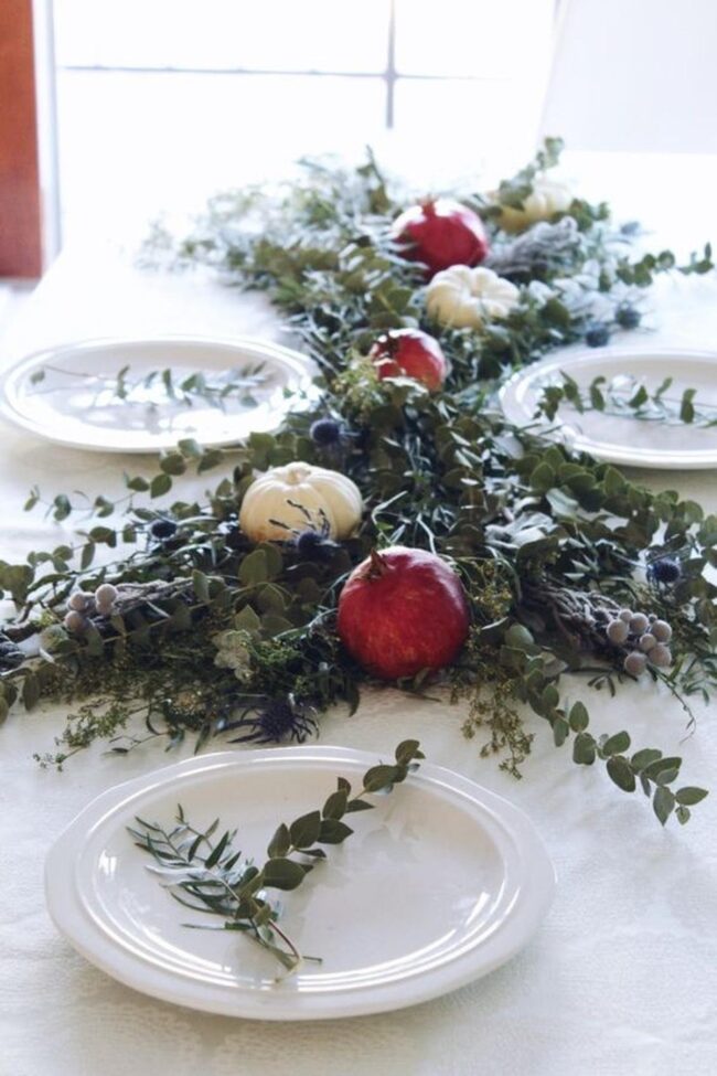 Greenery cascading between seasonal decorations beautifies an ordinary dinner into a memorable gathering that feels both intentional and effortlessly beautiful.