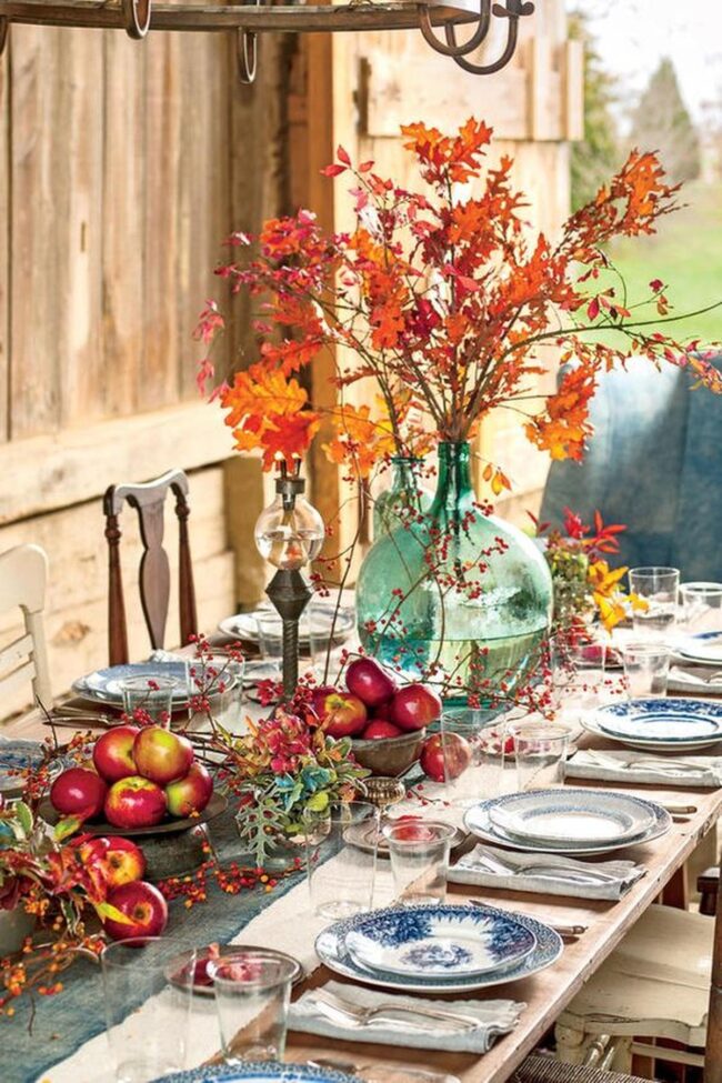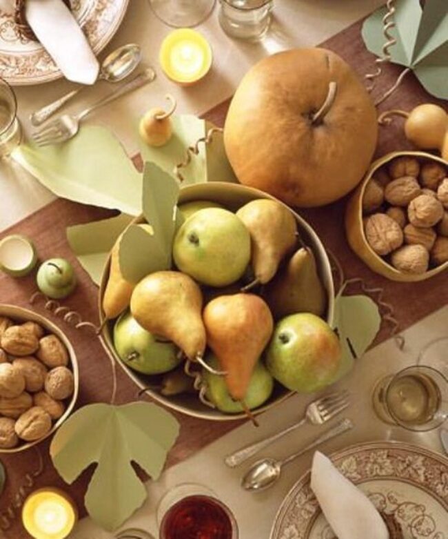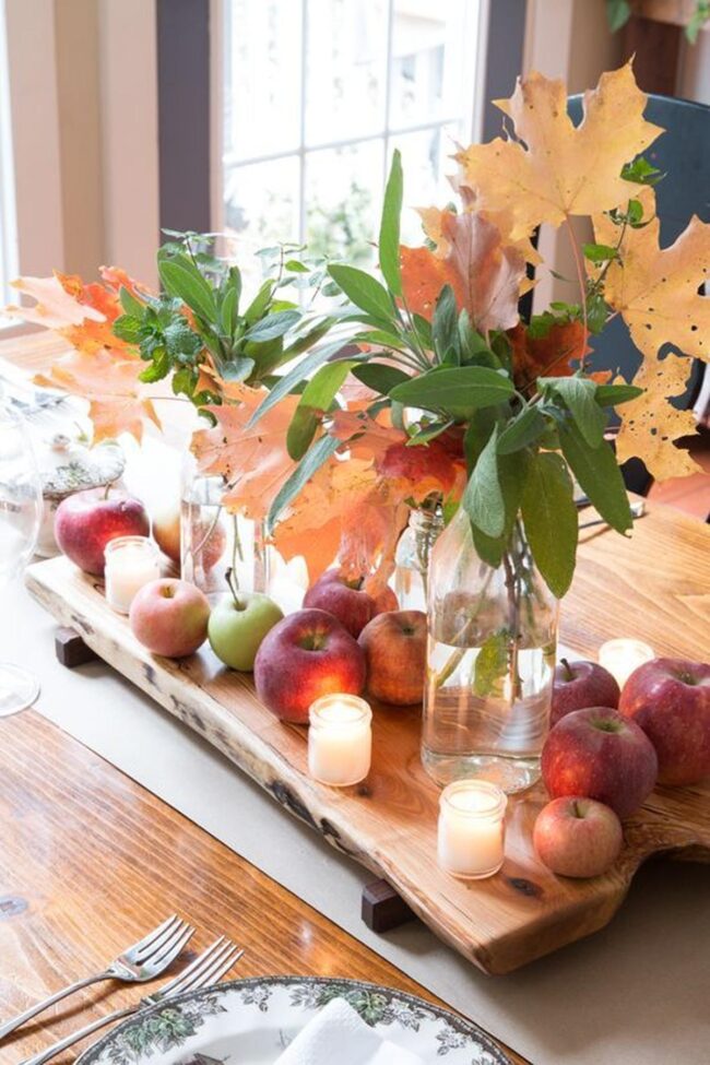 Wooden centerpieces burst with seasonal charm when red and green apples mingle among autumn leaves, creating an instant dining table wow factor.