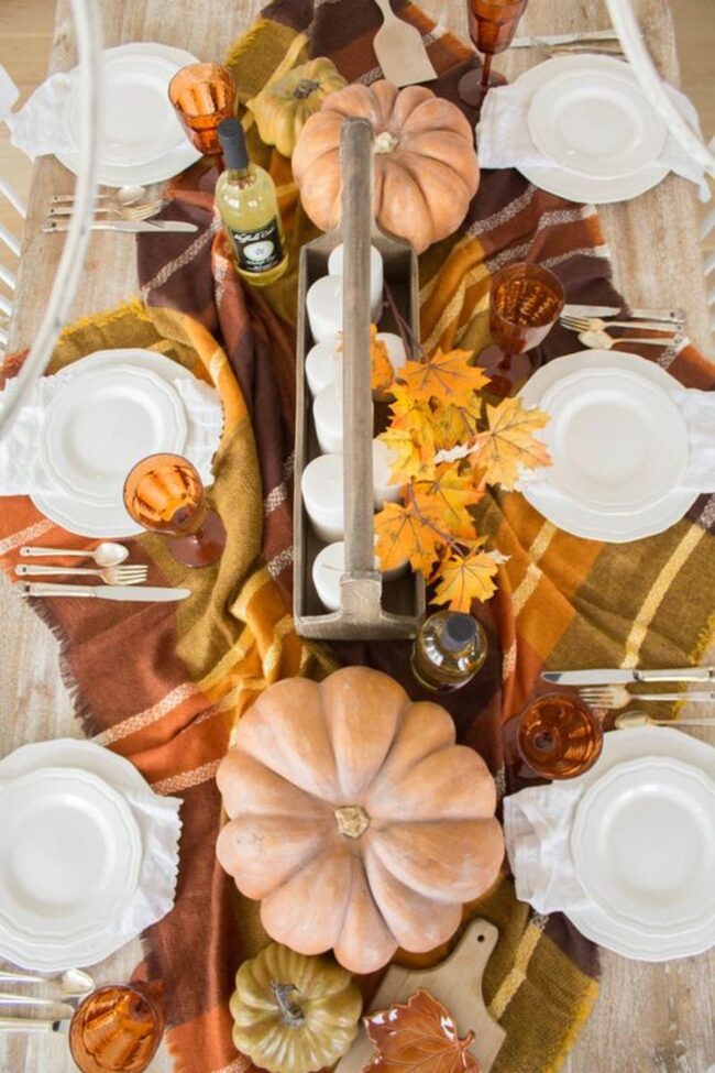 Soft plaid runners in warm orange, brown, and golden yellows weave together every design element, breathing seasonal spirit into the space.