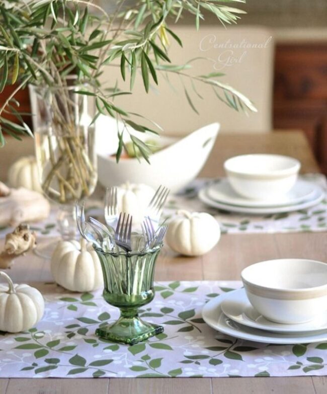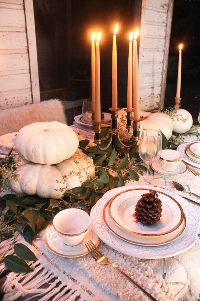 White pumpkins nestled among verdant branches weave natural beauty into your dinner scene without shouting for attention.