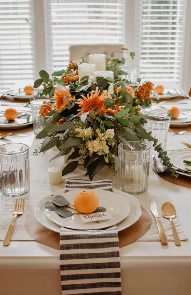 Cheerful small oranges nestle on each plate, bringing unexpected bursts of color that wake up the entire setting.