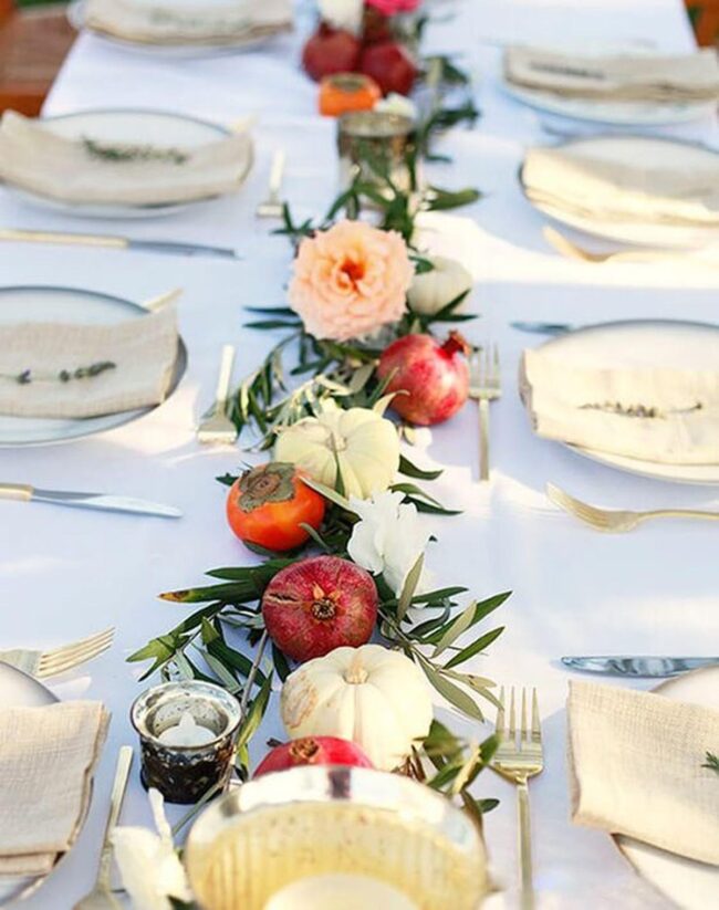 Pomegranates and petite white pumpkins dance together in a centerpiece that catches every eye, creating a natural focal point that feels effortlessly chic.