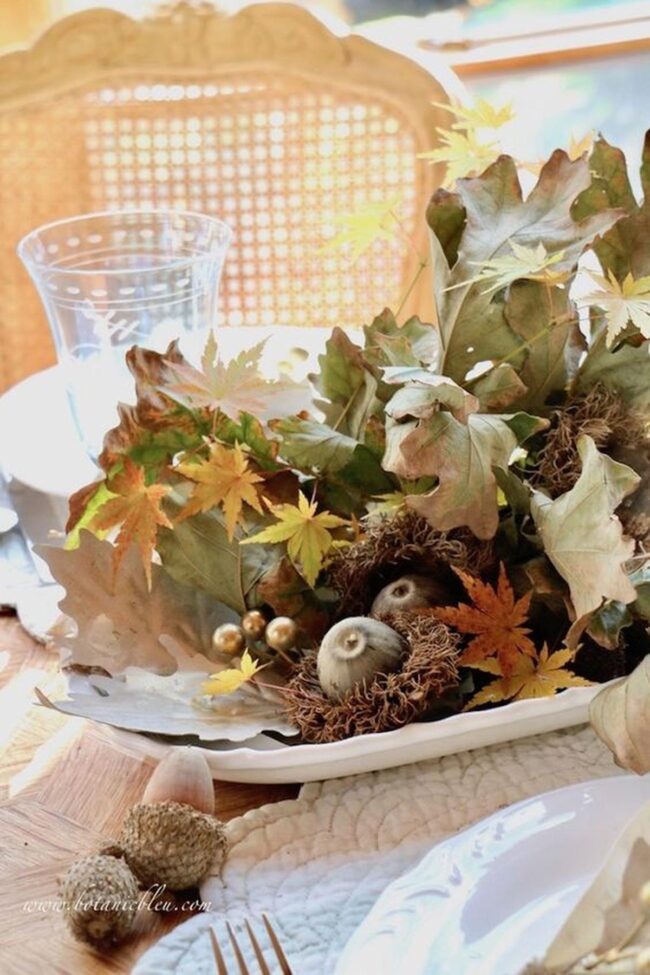 Subtle details like a single fallen leaf sprawled across the tablecloth connect your indoor space with the rich outdoor landscape.