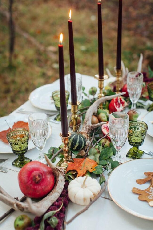 Brass candle holders support slender golden tapers, casting enchanting shadows across the tablescape and infusing warmth into every corner.