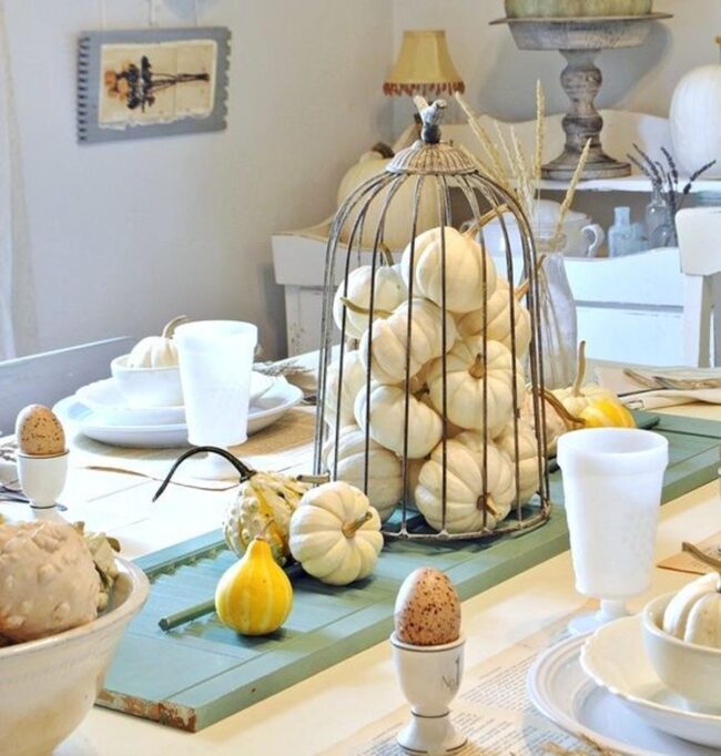 Seasonal magic dances across your dining space with charming white and yellow mini pumpkins nestled playfully inside a wire cage, spreading autumn's soft embrace.
