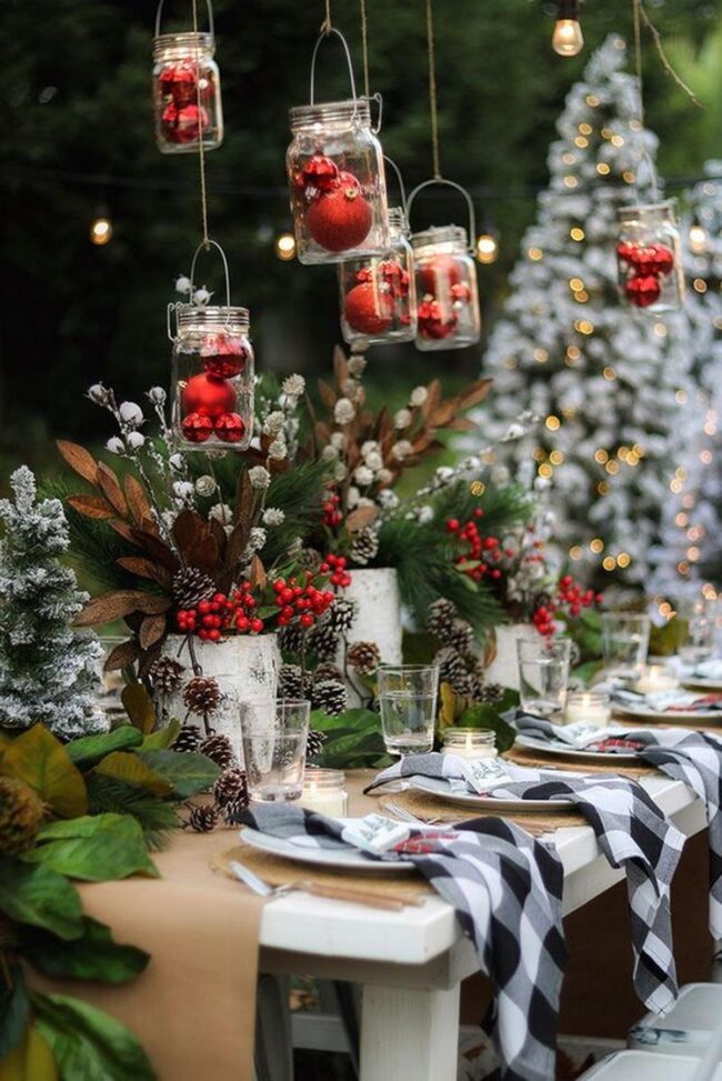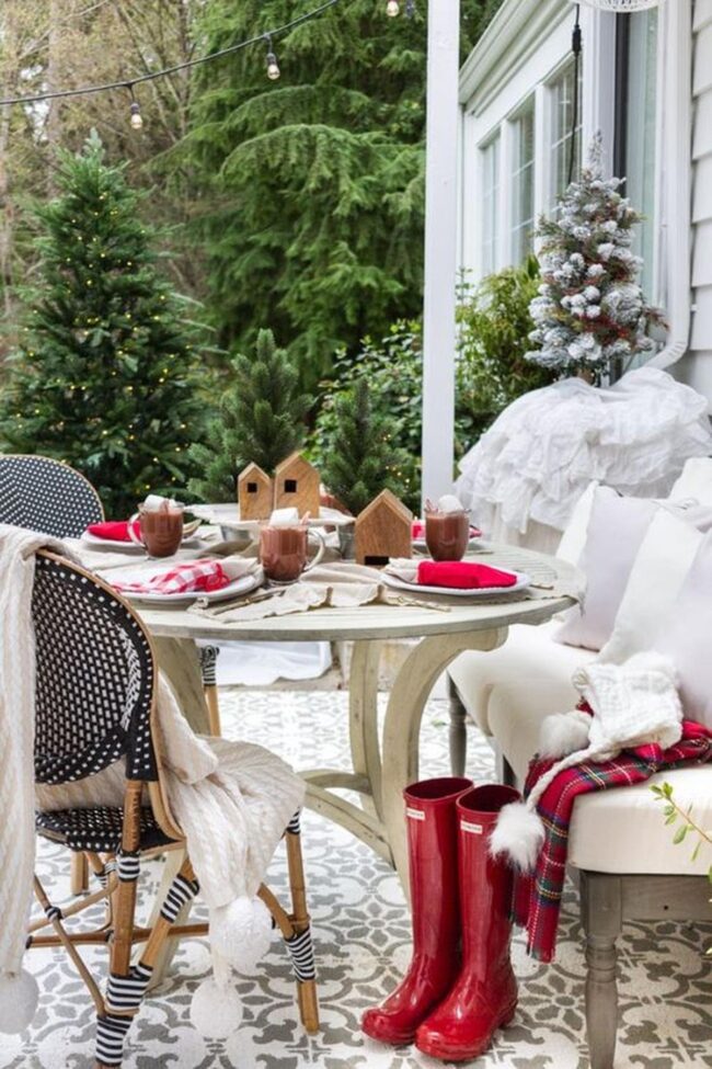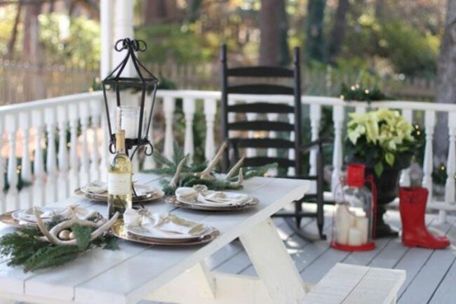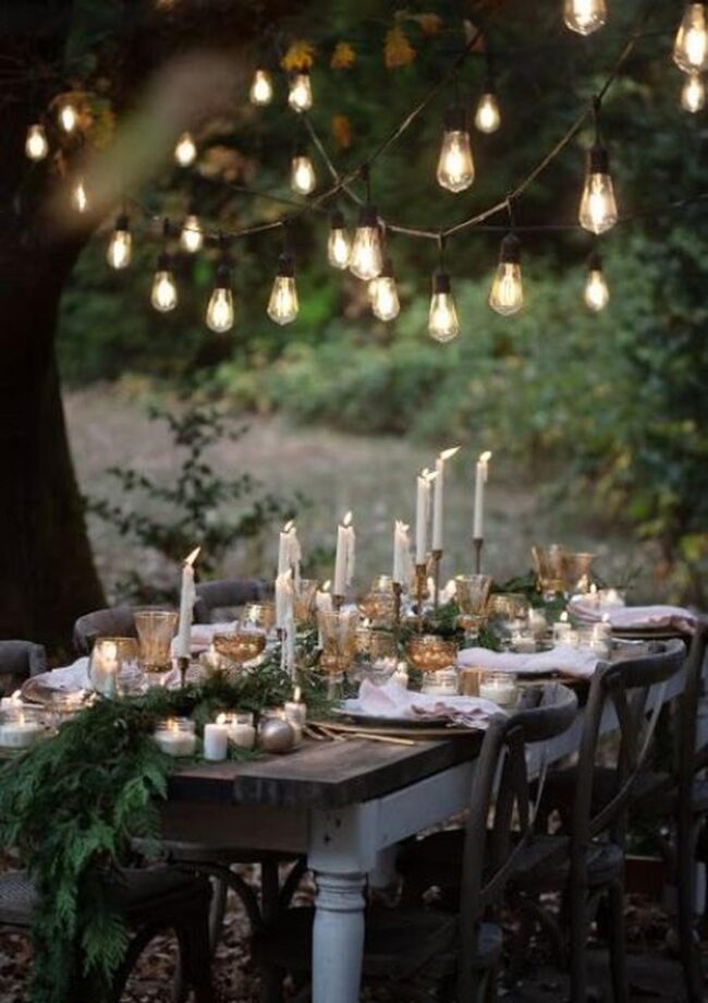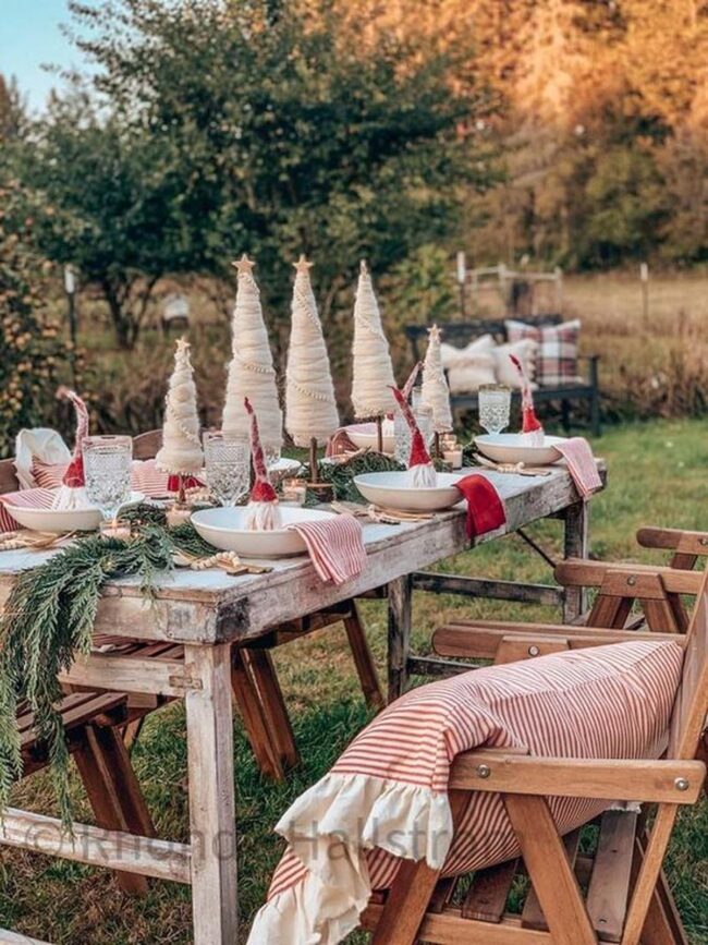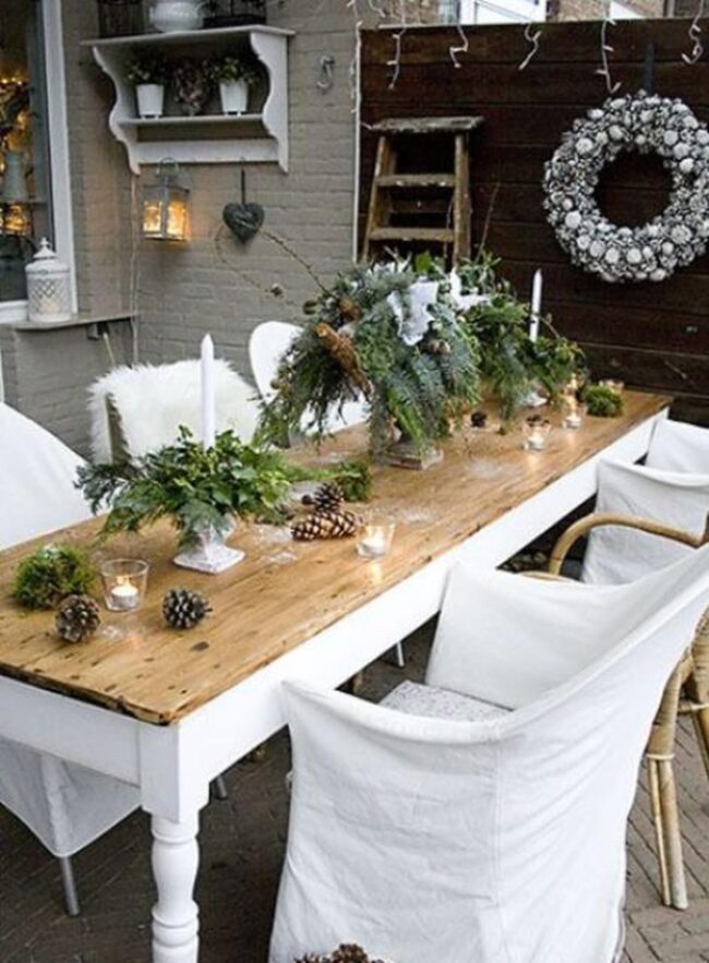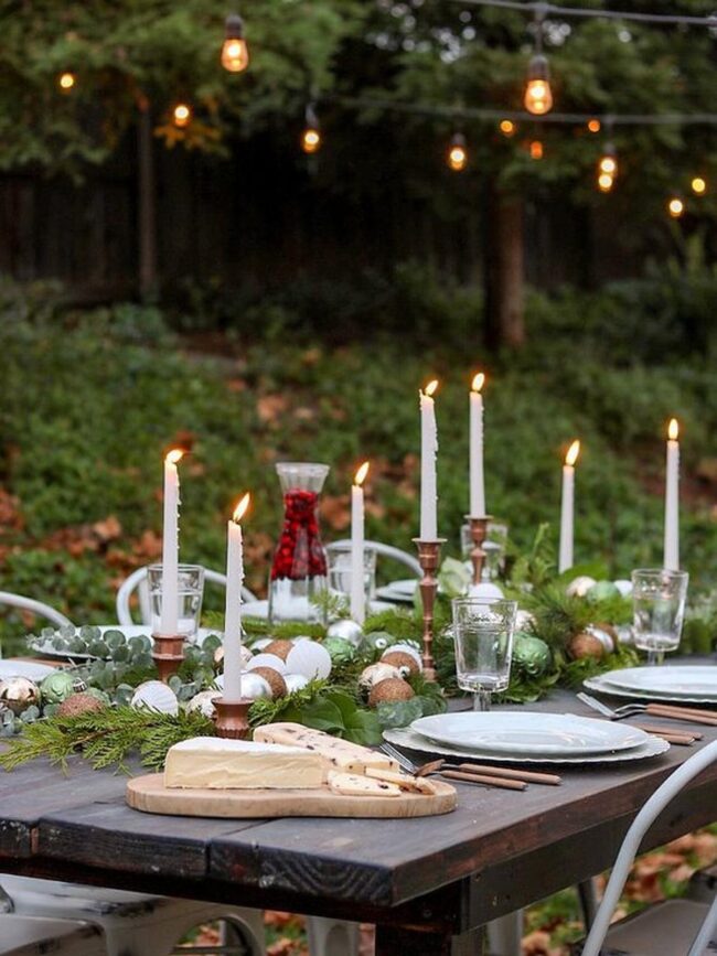 Twinkling string lights, evergreen garlands, and flickering candles transform patios or gardens into festive sanctuaries.