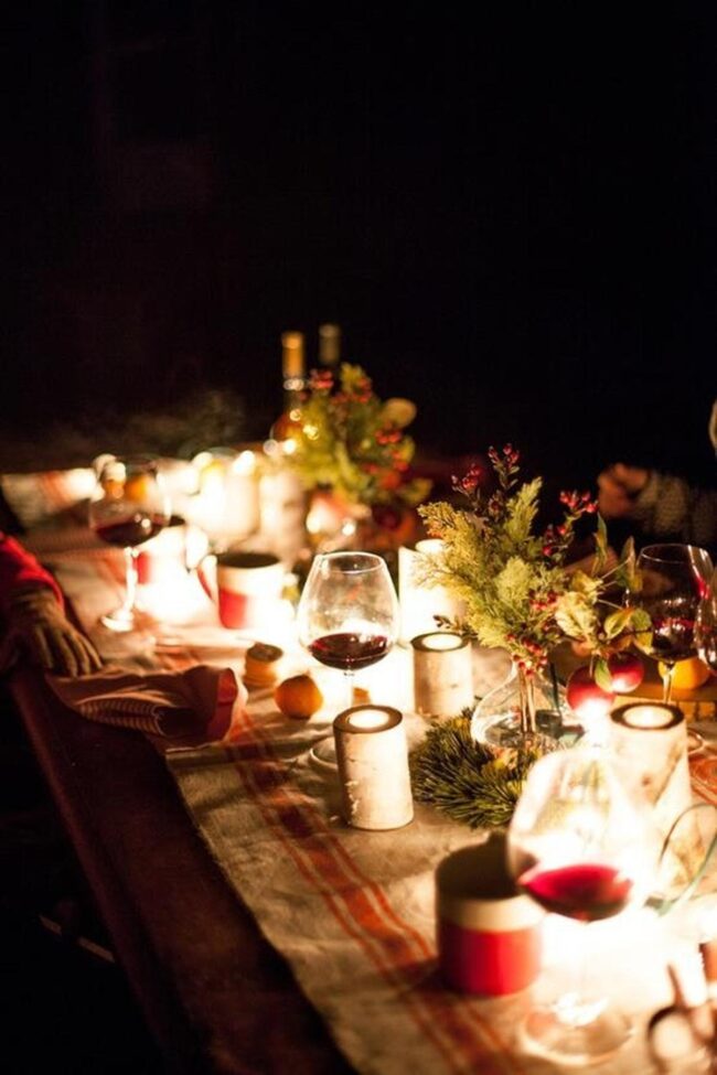 Red candles nestled among pine garlands create soft, magical illumination that draws people closer together.