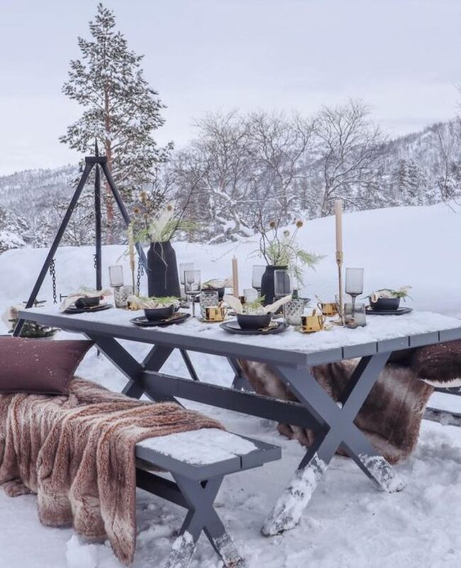 Outdoor dining becomes an unexpected celebration where simplicity meets stunning design, making everyone feel welcome and cherished in this magical winter scene.