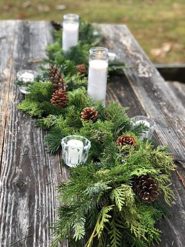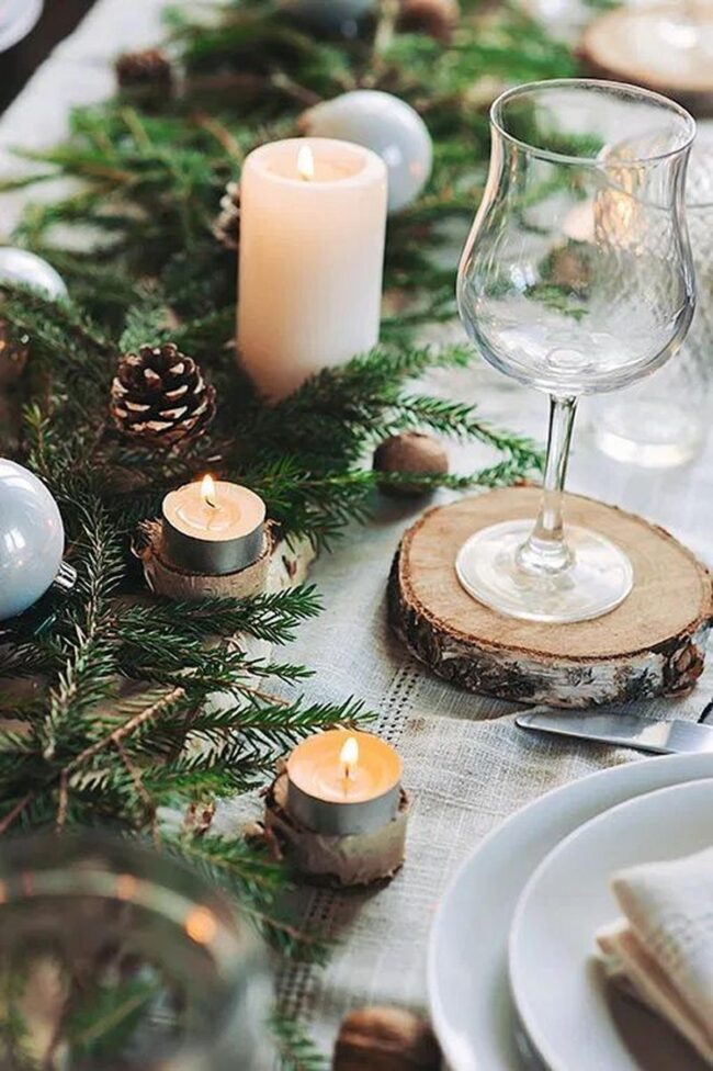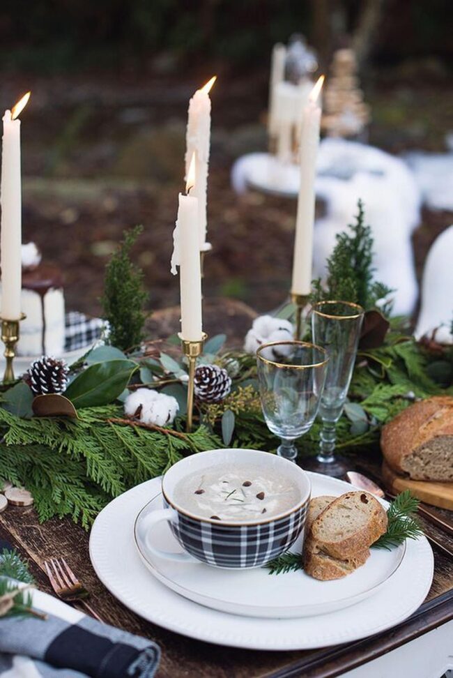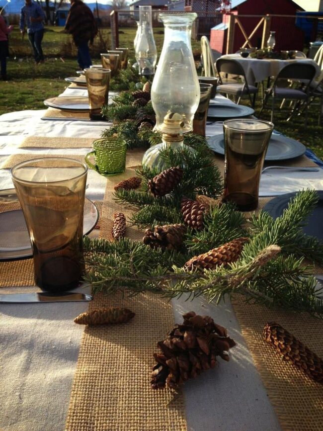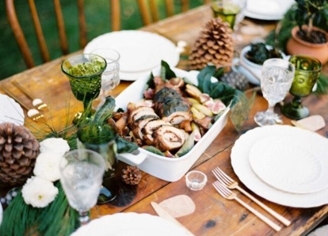 Lush greenery winds down the table's center, sprinkled with pine cones and seasonal ornaments that celebrate natural beauty and connection.