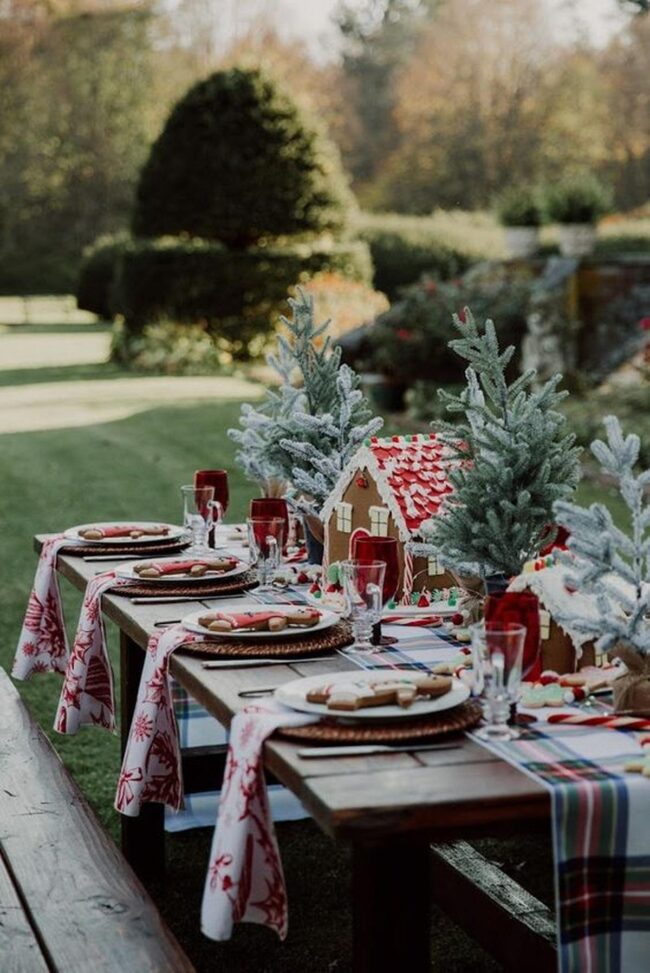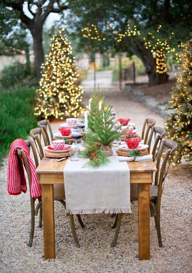 Twinkling yellow lights from a nearby Christmas tree cast enchanting shadows, redesigning your outdoor dining area into a memorable backdrop for joyful conversations.