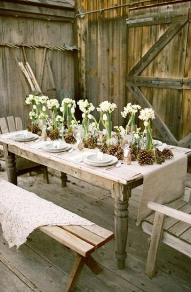 Delicate pine cones and lush greenery weave through the centerpiece, tweaking an ordinary table into a breathtaking landscape of natural beauty.