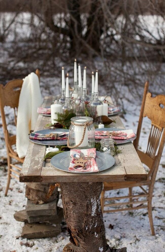 Winter dining magic comes alive outdoors with natural wooden tables anchored by massive tree trunk legs, creating an inviting space where friends naturally gather.