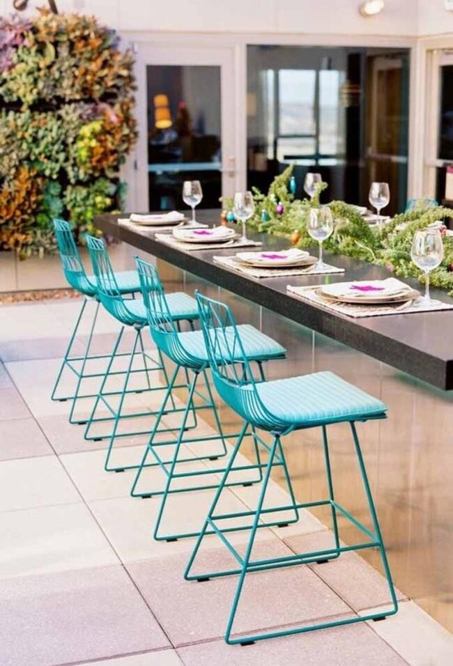 Cool turquoise bar stools instantly spark conversation against rich dark countertops, making every corner feel like a welcoming sanctuary where memories brew alongside morning coffee.