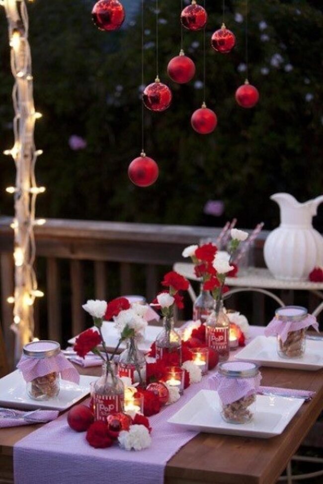 Carefully positioned red candles nestle in delicate glass holders, their gentle glow promising intimate conversations and shared moments.